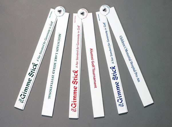This Gimme Stick™ choice is recommended for non-sanctioned golf tournaments such as club events and charity events and is a favorite among country clubs because regular players or members can reuse the stick for different event types throughout the golf season.This Gimme Stick™ choice is recommended for both casual and event play and uses score to make the gimme determination. A putt for triple bogey or higher, three or more over par.This Gimme Stick™ format choice incorporates the view of a gimme as a reward for a good shot and offers a fun variety to any casual or event round. The basic premise is that a shot from off the green should be awarded a marginally longer gimme distance than a shot originating from on the green because they are more difficult to hit close to the hole.